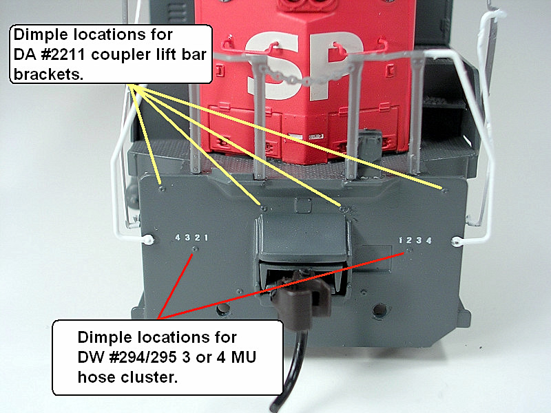 Athearn's toolmaker was gracious enough to cut location dimples into the molds which allows easier installation of detail parts. In the photo below I've outlined some of those location dimples.